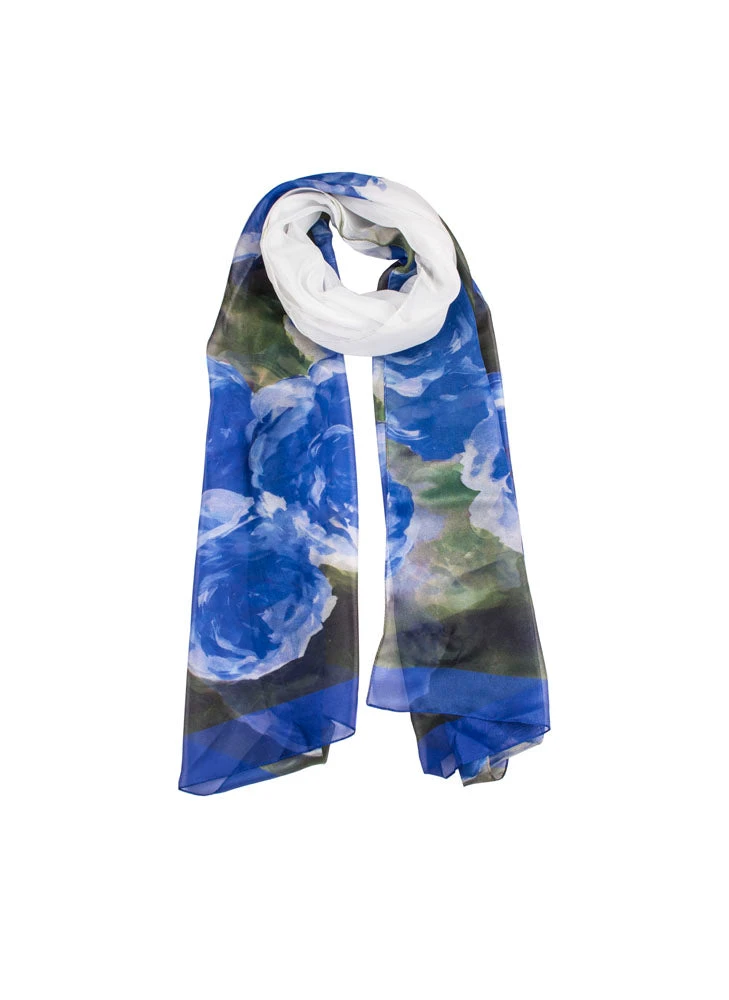 Inspired by the classic rose, this colourful voile scarf features a floral print and block colour edging.