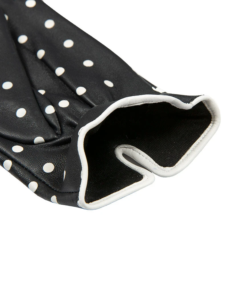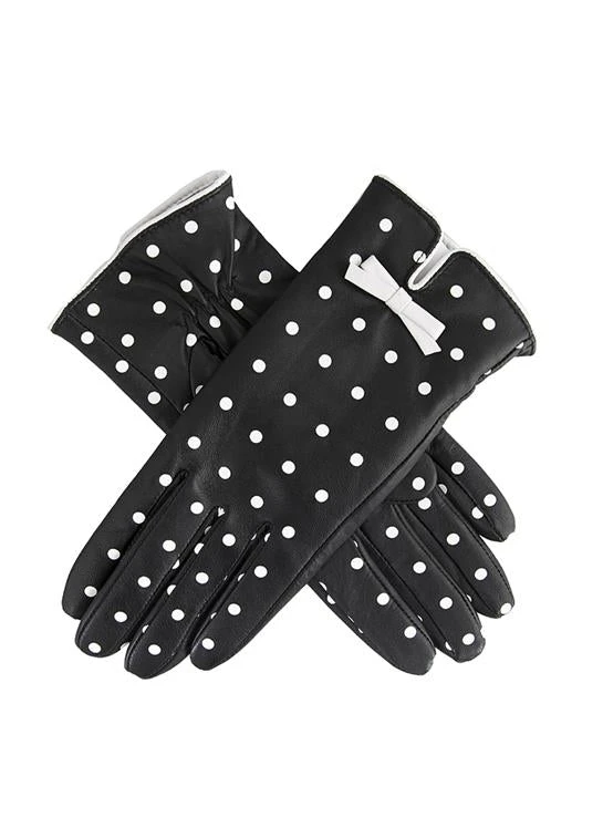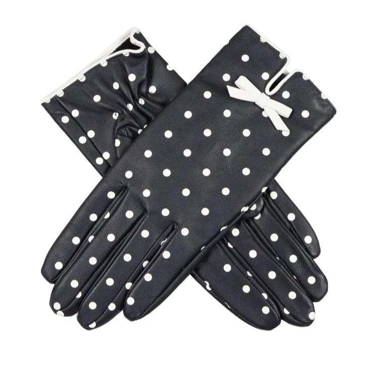 Say it with spots this season with our Isabella leather gloves. Crafted from high-quality hairsheep leather, they feature a timeless polka dot design that brings personality and elegance to any ensemble. These fashionable gloves are finished with a cute leather bow and lined with silk for a comfortable fit. Offered in your choice of navy or black with white polka dots, these chic gloves work well for both smart occasions and everyday wear.