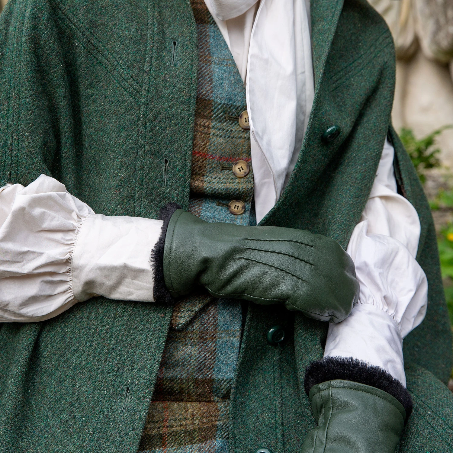 - Three-point decorative stitching on the back of the mittens elongates the look of the hand for a refined appearance